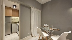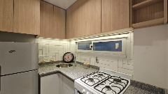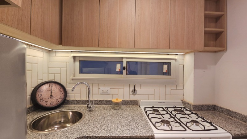 Ingreso a un luminoso living comedor, con pisos de porcelanato símil madera, y cocina separada equipada con artefacto de cocina, termotanque eléctrico y ventilación natural.