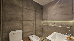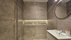 A través de un distribuidor accedemos al baño completo con mampara y a los dormitorios: