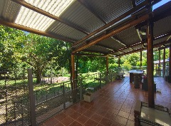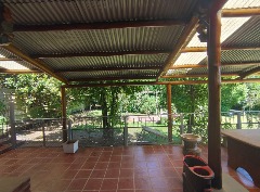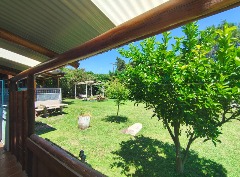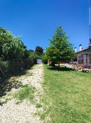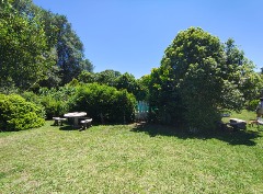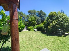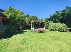 Amplio parque arbolado con pérgola, entorno natural y relajado.